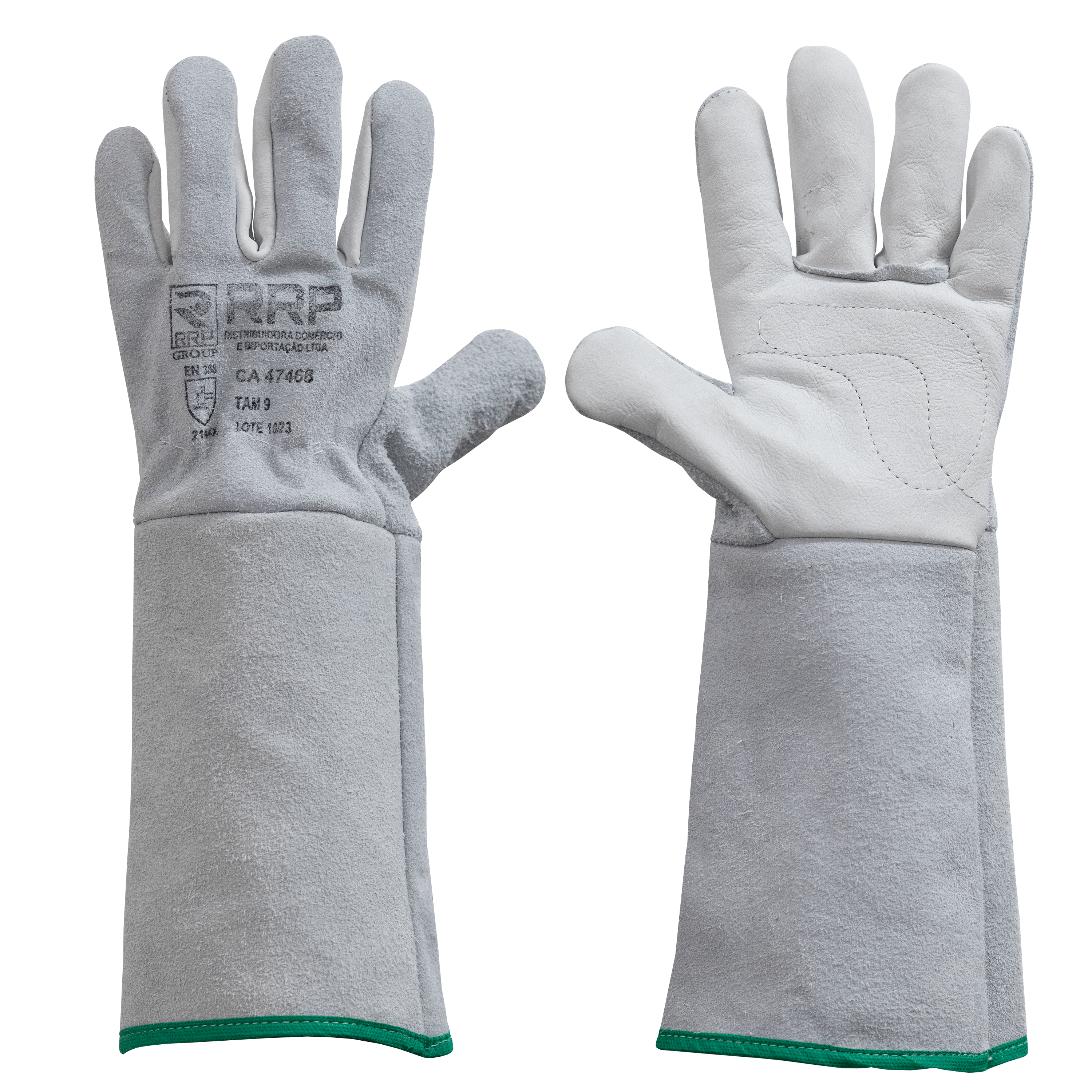 Luva de segurança confeccionada em vaqueta na face palmar e raspa na face dorsal e punho, com reforço em raspa na palma. Punho de 20 cm.